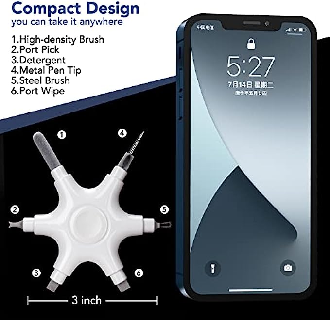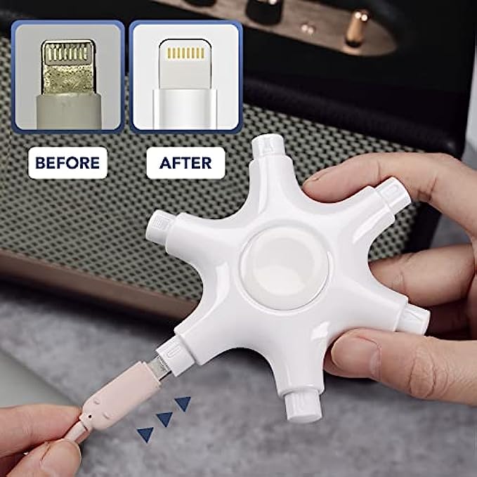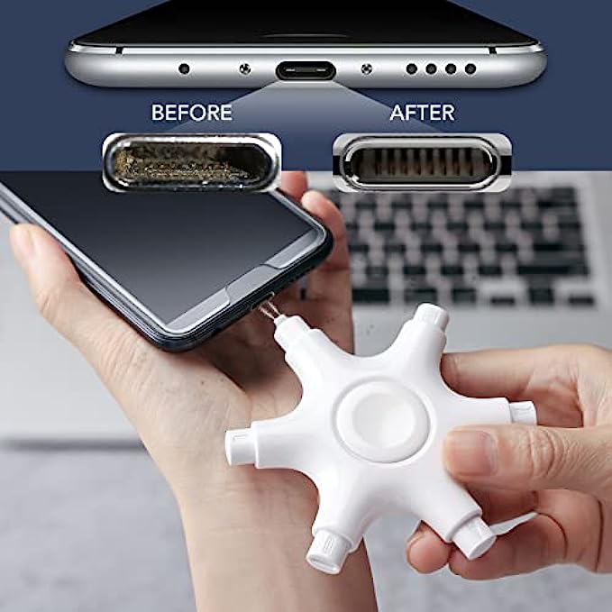 【Clean & Repair Charging Port】The port hook, steel U brush and port wipe in this cleaning kit for iphone can clean the stains, hair, fluff, rust, oils and other contaminants out from your charging port. Cleaning tools can protect the connectors of cell phone devices, thoroughly clean the charger port of mobile phone. Keep your cell phone looking new and shiny. Multi-tool is the perfect solution to keep your phone, earphones, and other accessories clean and extend the lifetime. 【Fix Unreliable Charging and Poor Connection】Do you have any trouble when charging? The cleaning kit helps repair intermittent charging, charging slow, oxide damage on connectors. Through cleaning, restoring damaged ports and charging cables, unreliable connections can be eliminated. Our phone cleaning kit can extend and protect the service life of your devices. Note: This phone cleaner supports type C port and ports for iphone, cables, but not supports the type C cables. 【Clean Your Earphones】Our multi-functional cleaning kit for airpods can clean the gunk, lint on the Bluetooth earphones case, speakers, switches, tiny gap and the front surface of earphones. The metal pen tip and high-density velvet soft brush are the convenient and effective tools to clean earphones. By improving hygiene condition, audio quality and connectivity, our cleaner kit for airpod can restore your loved devices to a new one. Regular use can keep your electronic product shiny as ever. 【Upgraded Material & Workmanship】Our phone repair kit uses premium silicone and wear-resistant PP material, which is not easy to deform and fall off. Different from others, our main body of the shell adopts ultrasonic workmanship and integrated design, ensures no crack. Easy to insert and out. Don't worry about get stuck or destroy the original design. 【Fidget Toy Gift & What you will get】 You can hear a satisfying “click” sound when insert the tools, which is similar to a stress relief toy. And the earpods cleaner kit can rotate on table. Perfect gift for your friends or families. The package includes 1 x cleaning kit for charging port, 4 x cleaning putty, 1 x cloth and 1 x manual. If you encounter any problems during use, please feel free to contact us. Specific Uses For Product Restore oxide damaged cable contacts, For all Lightning ports & cables, Remove all types of debris Compatible Devices Lightning Ports, IPad, Ligthning Cables, IPhone,Phone, Type C charging port